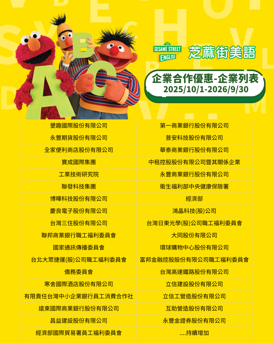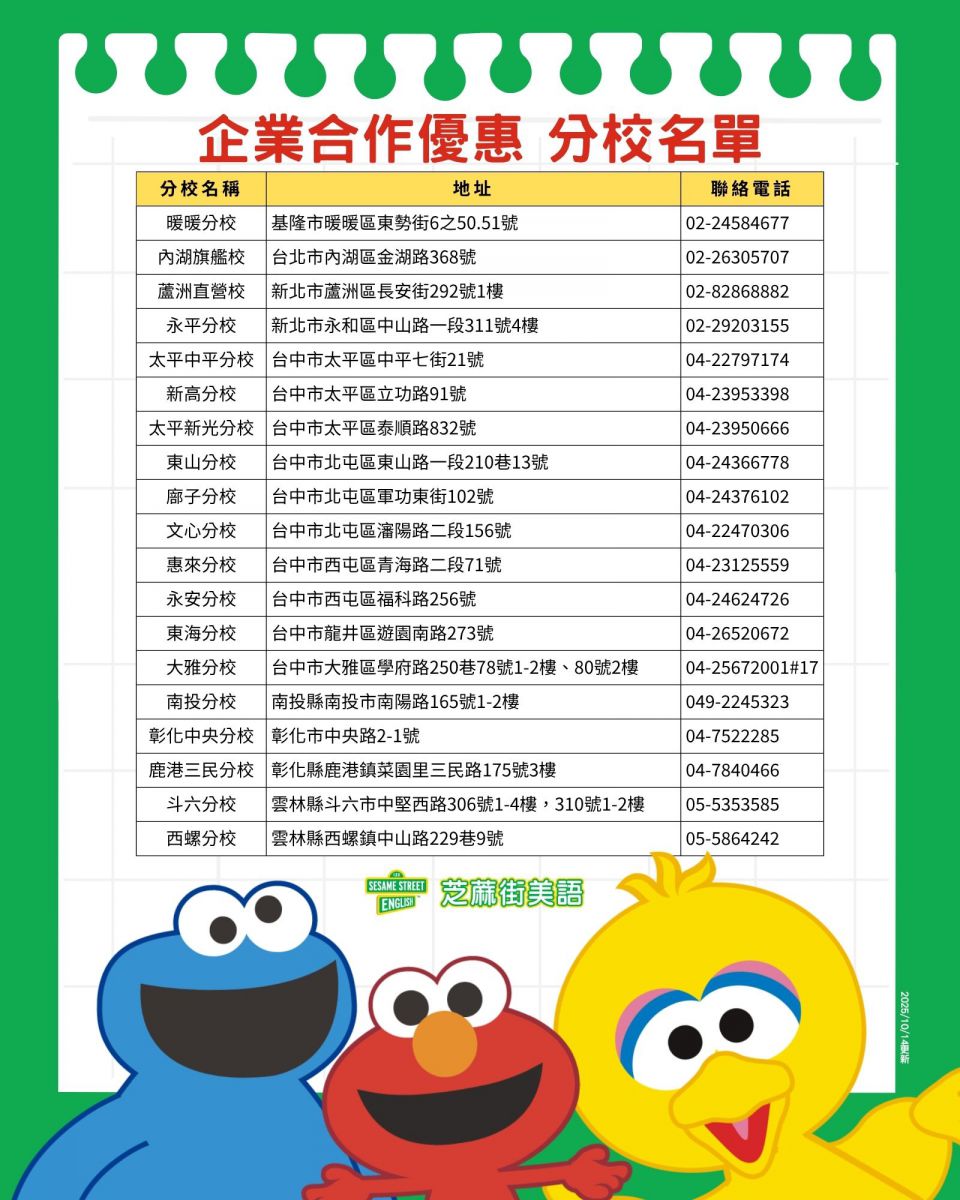 配合『企業合作優惠』的芝蔴街美語學校名單,請至各單位承辦人洽詢。